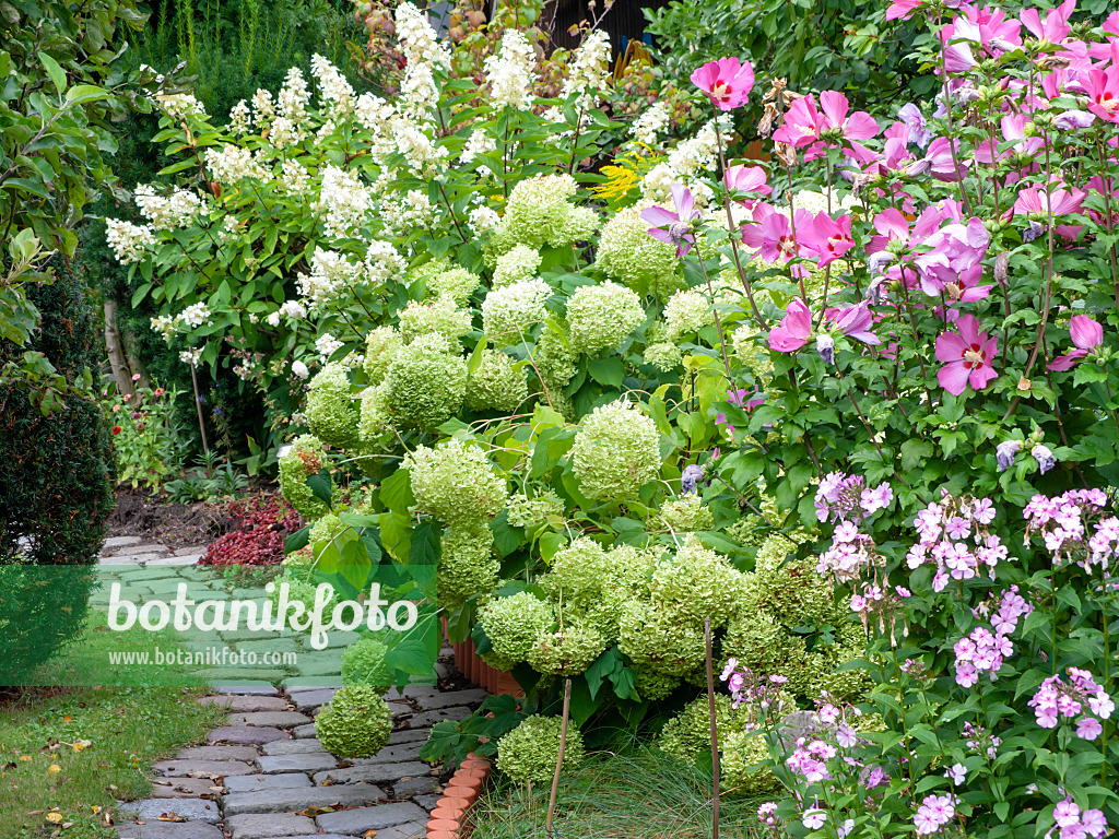 Panicle hydrangea (Hydrangea paniculata), tree hydrangea (Hydrangea arborescens), rosemallow (Hibiscus) and garden phlox (Phlox paniculata)