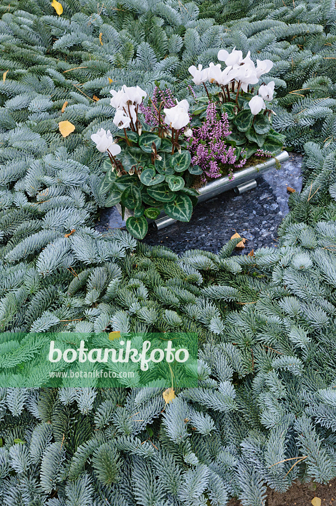 Alpenveilchen (Cyclamen persicum) auf einem mit Tannenzweigen bedeckten Grab
