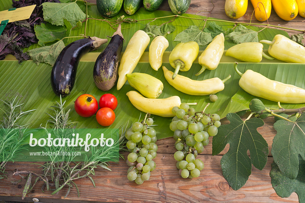 Auberginen (Solanum melongena), Tomaten (Lycopersicon esculentum), Gemüsepaprika (Capsicum) und Weinreben (Vitis vinifera)