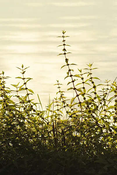 Basilikum (Ocimum basilicum 'Purple Ruffles'), Knoblauch (Allium sativum) und Minze (Mentha)