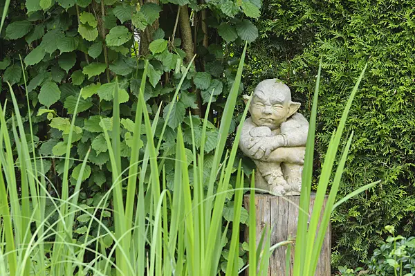 Bizarre steinerne Gartenskulptur eines hockenden Gargoyle