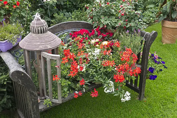 Blauer Kartoffelbaum (Lycianthes rantonnetii syn. Solanum rantonnetii), Sonnenauge (Heliopsis helianthoides), Begonie (Begonia) und Schwarzäugige Susanne (Thunbergia alata) in einem Kleingarten