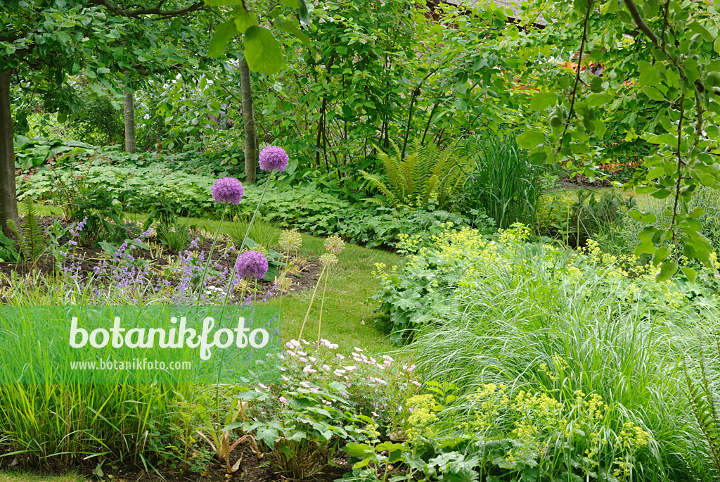 Blutroter Storchschnabel (Geranium sanguineum), Weicher Frauenmantel (Alchemilla mollis) und Lauch (Allium aflatunense)
