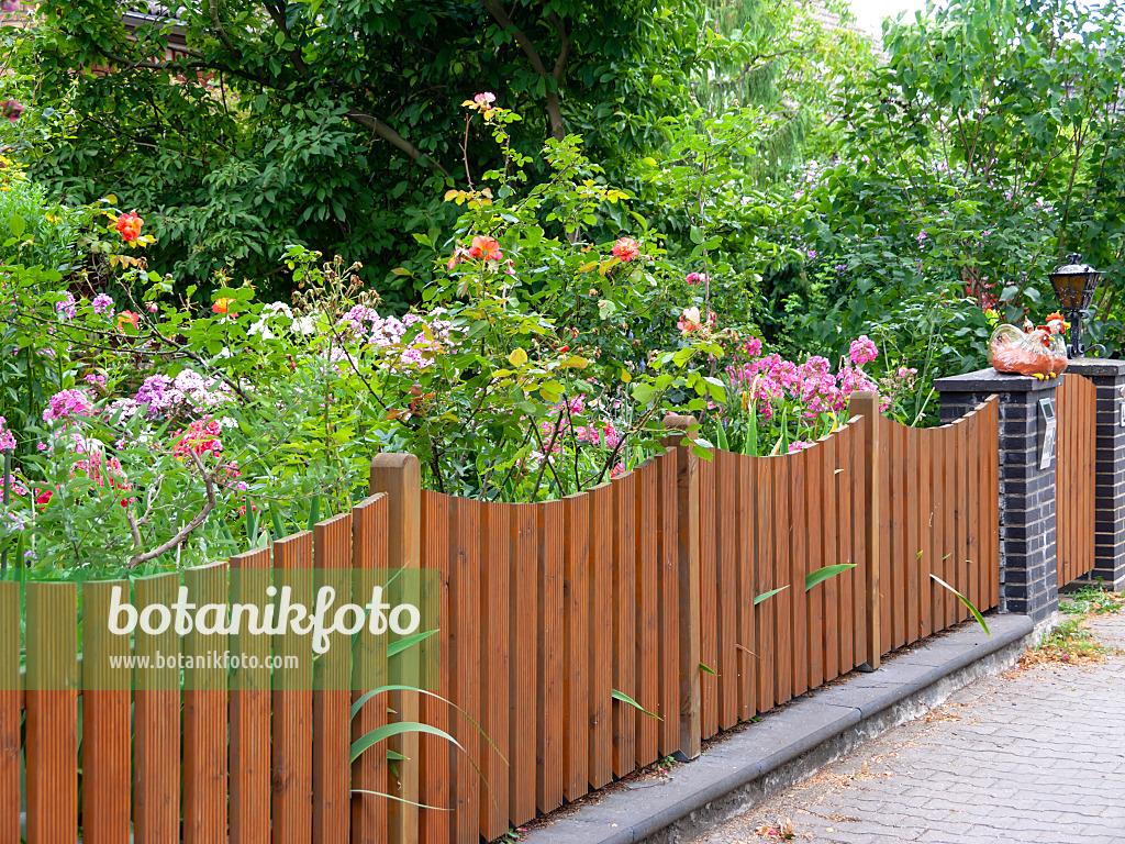 Brauner Friesenzaun aus Holzlatten mit Bögen vor einem blühendem Staudengarten