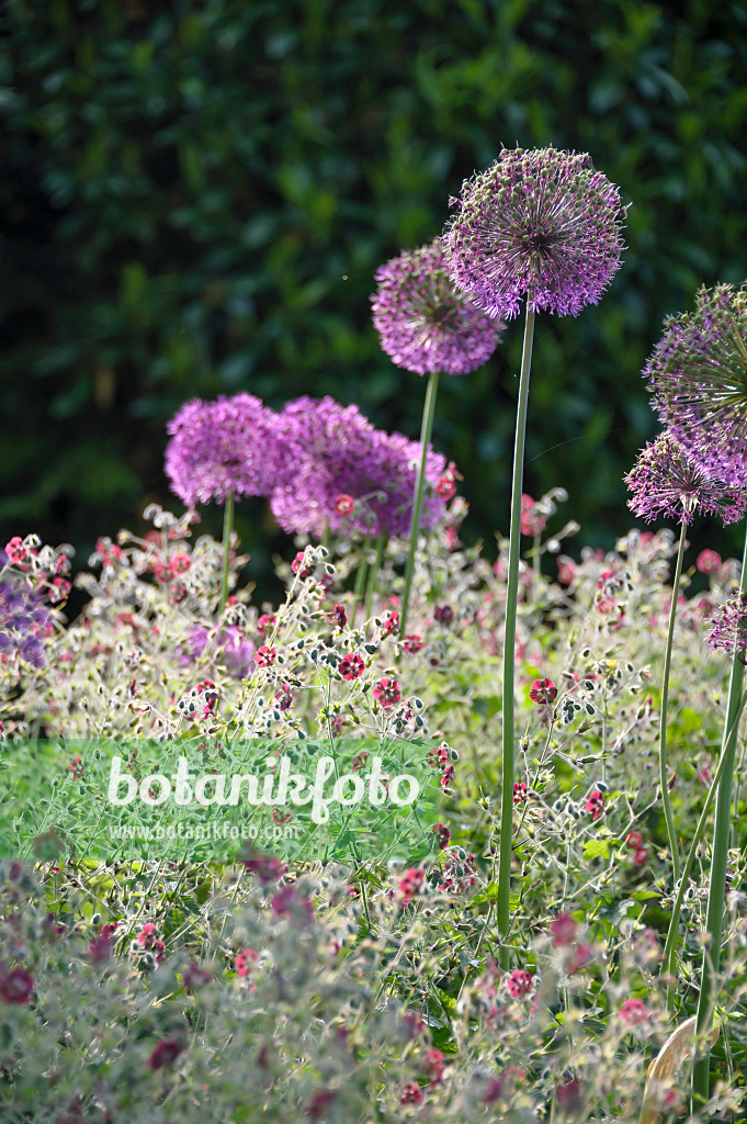 Brauner Storchschnabel (Geranium phaeum) und Lauch (Allium aflatunense)