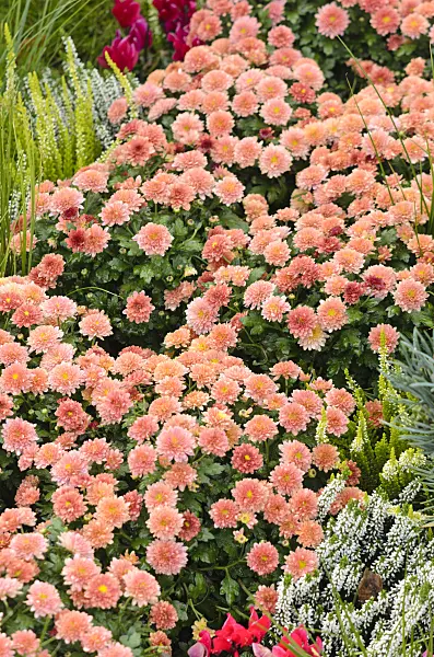 Chrysantheme (Chrysanthemum indicum 'Cinderella') und Kleiner Fuchs (Aglais urticae)