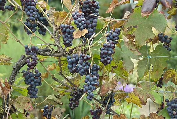 Dahlien (Dahlia) und Weinrebe (Vitis vinifera)