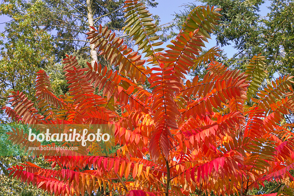 Rhus hirta, auch bekannt als Essigbaum oder Hirschkolbensumach, ist ein sommergrüner Strauch oder kleiner Baum. Er stammt aus Nordamerika und wird oft wegen seiner auffälligen roten Herbstfärbung und dekorativen Fruchtstände angepflanzt. Die Pflanze ist anspruchslos und trockenheitsresistent, kann aber durch Ausläufer invasiv werden. Achtung: Der Saft kann Hautreizungen verursachen.