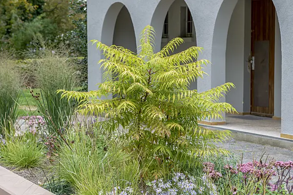 Essigbaum (Rhus hirta syn. Rhus typhina) und Kanadische Goldrute (Solidago canadensis var. scabra)