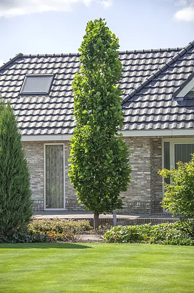 Europäischer Perückenstrauch (Cotinus coggygria) und Amerikanischer Tulpenbaum (Liriodendron tulipifera) an einem Holzzaun