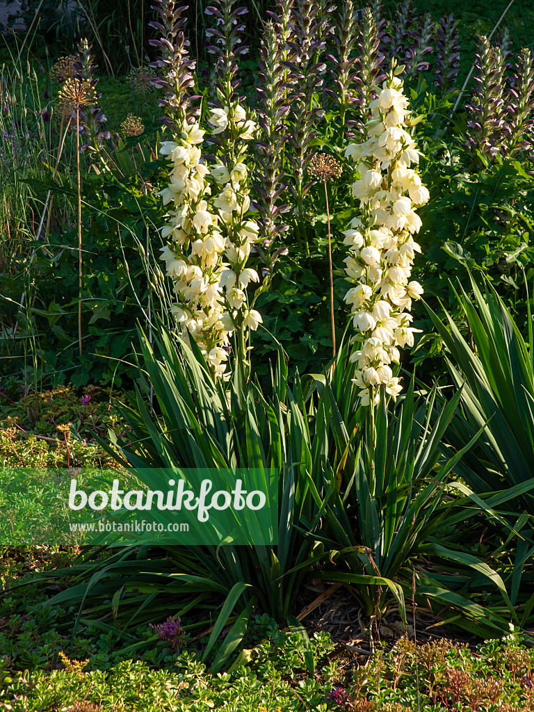 Yucca filamentosa, auch Fädige Palmlilie genannt, ist eine immergrüne Staude aus der Familie der Spargelgewächse. Sie stammt aus dem Südosten der USA und ist bekannt für ihre schwertförmigen Blätter mit fadenartigen Fasern an den Rändern. Im Sommer bildet sie hohe Blütenstände mit weißen, glockenförmigen Blüten. Die Pflanze ist extrem trockenheitsresistent und bevorzugt sonnige Standorte mit durchlässigem Boden. Ideal für Steingärten oder als Solitärpflanze.