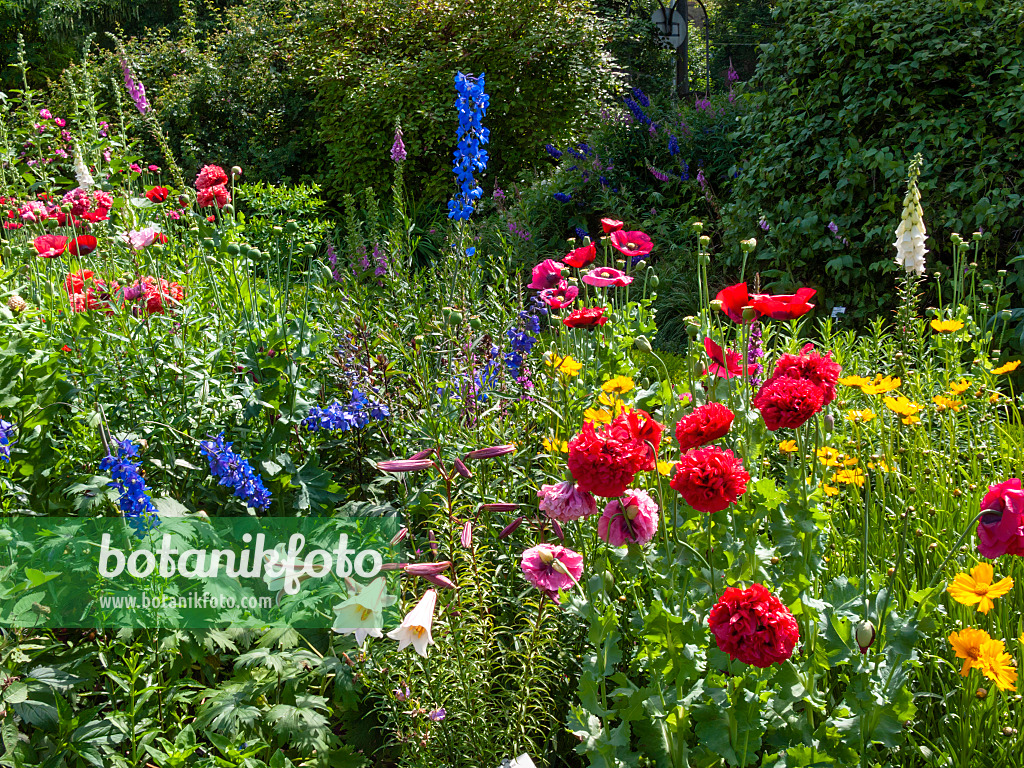 Fingerhüte (Digitalis), Mohn (Papaver) und Rittersporne (Delphinium) in einem bunten Bauerngarten
