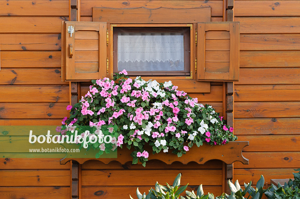 Fleißige Lieschen (Impatiens walleriana) an einer Gartenlaube