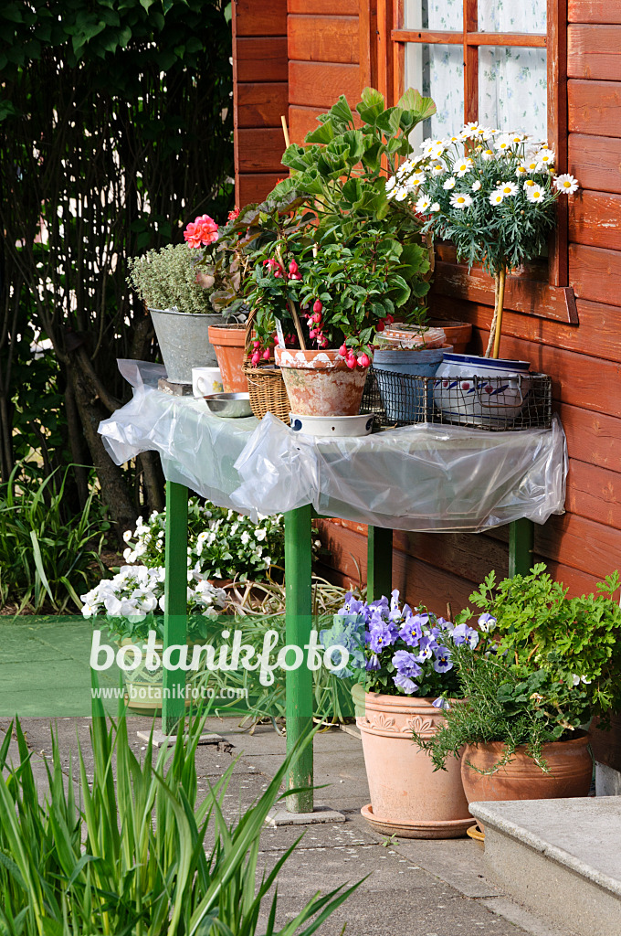 Fuchsien (Fuchsia), Margeriten (Leucanthemum), Veilchen (Viola) und Pelargonien (Pelargonium) auf einem Tisch vor einer Gartenlaube