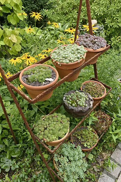 Funkien (Hosta) in Blumentöpfen auf einer Etagere