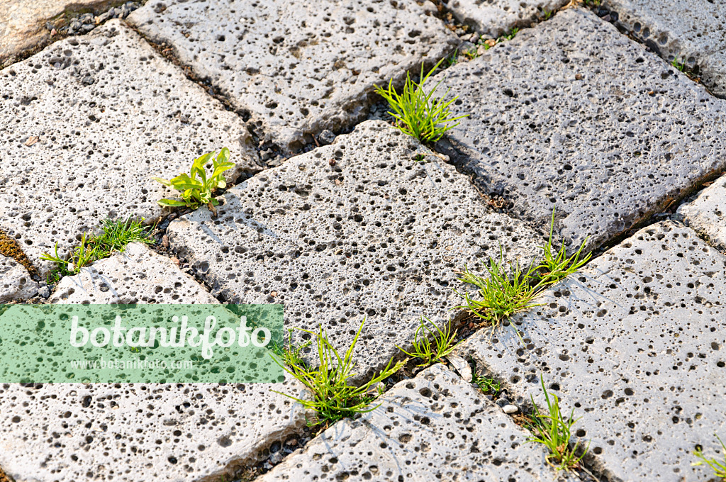 Gartenweg mit porösen Pflastersteinen und Unkraut