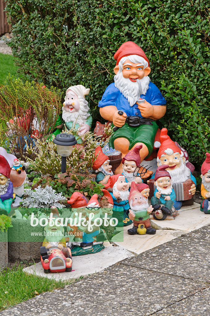 Gartenzwerge in verschiedenen Größen auf einer Terrasse vor einer Hecke
