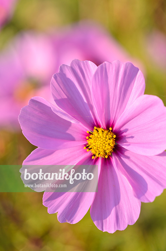 Cosmos bipinnatus, auch Schmuckkörbchen genannt, ist eine einjährige Zierpflanze aus der Familie der Korbblütler. Sie stammt ursprünglich aus Mexiko und zeichnet sich durch ihre filigranen, gefiederten Blätter und große, schalenförmige Blüten in Rosa, Weiß oder Purpur aus. Die Pflanze bevorzugt sonnige Standorte und durchlässige Böden, ist pflegeleicht und blüht von Sommer bis Herbst. Sie lockt Bienen und Schmetterlinge an und eignet sich gut für Beete, Rabatten oder als Schnittblume.