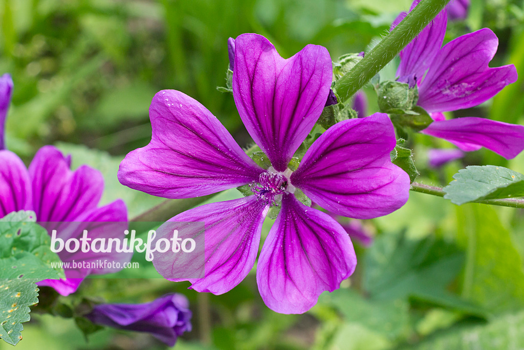 Malva sylvestris, auch Wilde Malve genannt, ist eine mehrjährige Pflanze aus der Familie der Malvengewächse. Sie blüht von Mai bis September mit violetten bis rosafarbenen Blüten und wird bis zu 120 cm hoch. Die Pflanze ist in Europa heimisch und wächst auf Wiesen, an Wegrändern und in Gärten. Ihre Blätter und Blüten sind essbar und werden in der Naturheilkunde bei Entzündungen und Husten eingesetzt. Sie bevorzugt sonnige Standorte und nährstoffreiche Böden.