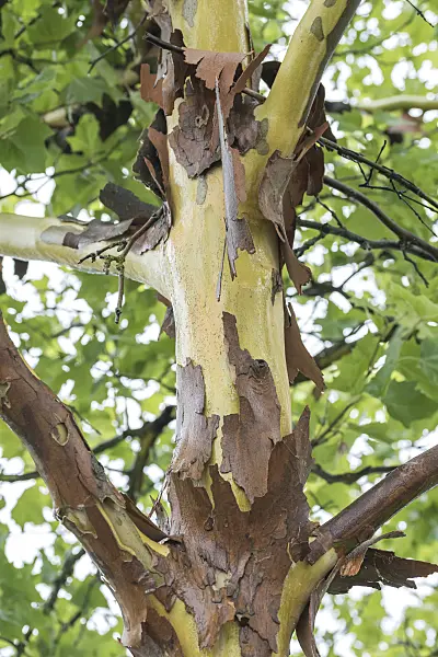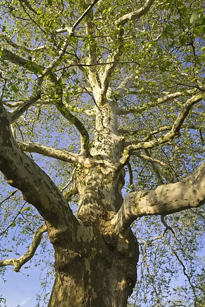 Die Platane (Platanus x hispanica) ist eine beliebte Hybridart aus der Gattung der Platanen. Sie entstand vermutlich aus einer Kreuzung der Amerikanischen und der Morgenländischen Platane. Charakteristisch sind ihre großen, handförmigen Blätter, die schuppige Borke und ihre hohe Toleranz gegenüber Stadtklima. Sie wird oft als Straßen- und Parkbaum gepflanzt, da sie robust und schnittverträglich ist. Die Platane kann bis zu 30 Meter hoch werden und bildet eine ausladende Krone.
