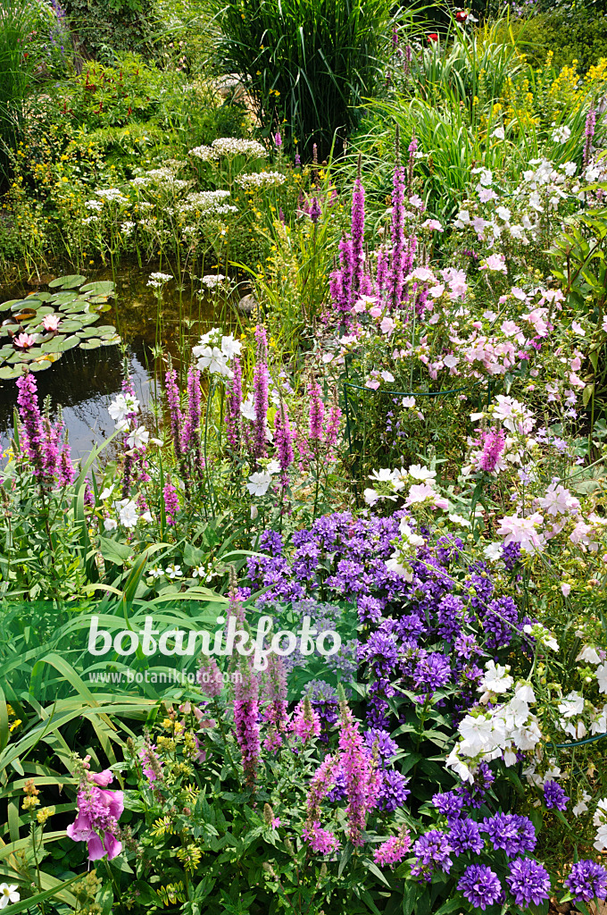 Gewöhnlicher Blutweiderich (Lythrum salicaria), Knäuelglockenblume (Campanula glomerata) und Malven (Malva) an einem Gartenteich
