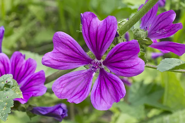 Gewöhnlicher Blutweiderich (Lythrum salicaria), Punktierter Gilbweiderich (Lysimachia punctata) und Malve (Malva) an einem Gartenteich
