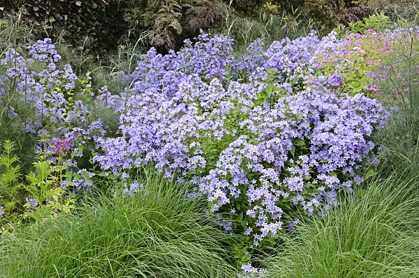 Glockenblume (Campanula) zwischen Feldsteinen vor einer Mauer