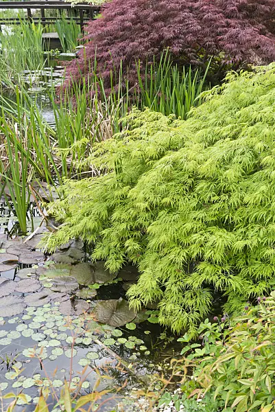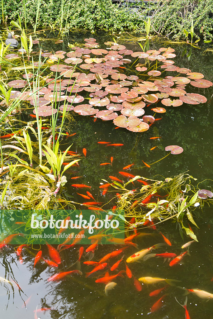 Goldfischee (Carassius auratus) in einem idyllischen Gartenteich mit Seerosenblättern
