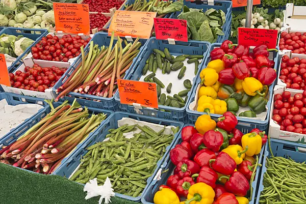 Gurken (Cucumis sativus) und Tomaten (Lycopersicon esculentum) in einem Foliengewächshaus