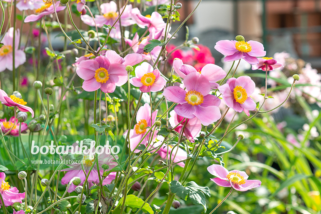 Anemone hupehensis var. japonica, auch Japanische Herbst-Anemone genannt, ist eine mehrjährige Staude aus der Familie der Hahnenfußgewächse. Sie blüht von August bis Oktober mit rosa oder weißen Blüten und erreicht eine Höhe von 60–90 cm. Sie bevorzugt sonnige bis halbschattige Standorte mit humosem, durchlässigem Boden. Diese Sorte ist winterhart und eignet sich gut für Staudenbeete oder als Schnittblume.