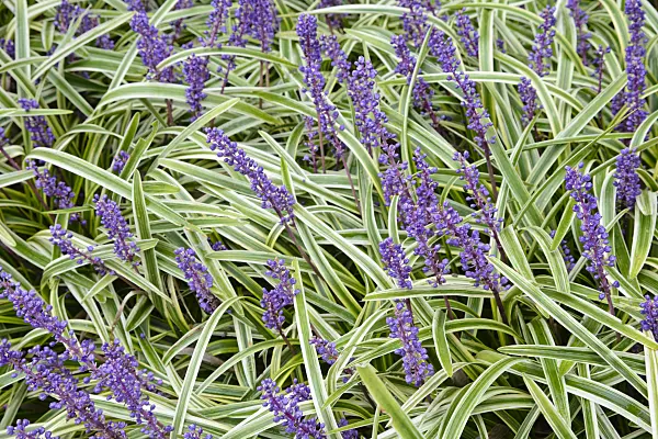 Herzblättrige Bergenie (Bergenia cordifolia 'Doppelgänger'), Traubenlilie (Liriope muscari) und Astern (Aster)