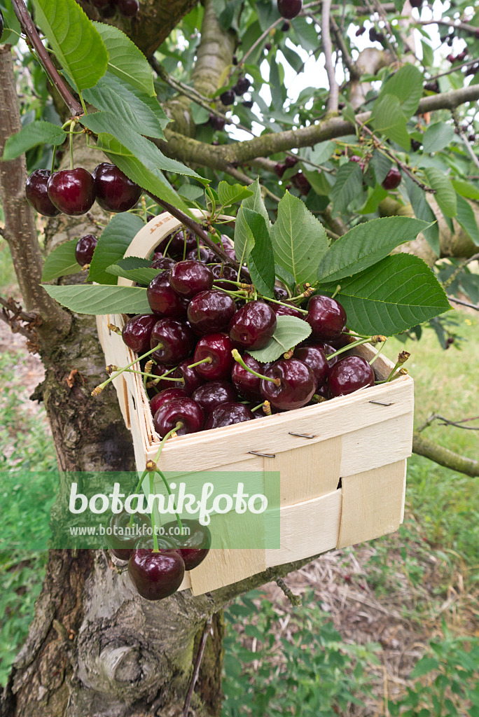 Herzkirschen (Prunus avium) in einem Spankorb auf einem Kirschbaum