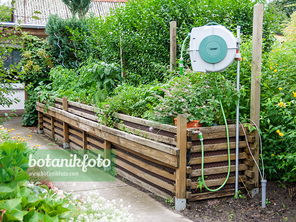 Hochbeet mit Wasserschlauch und Schlauchtrommel