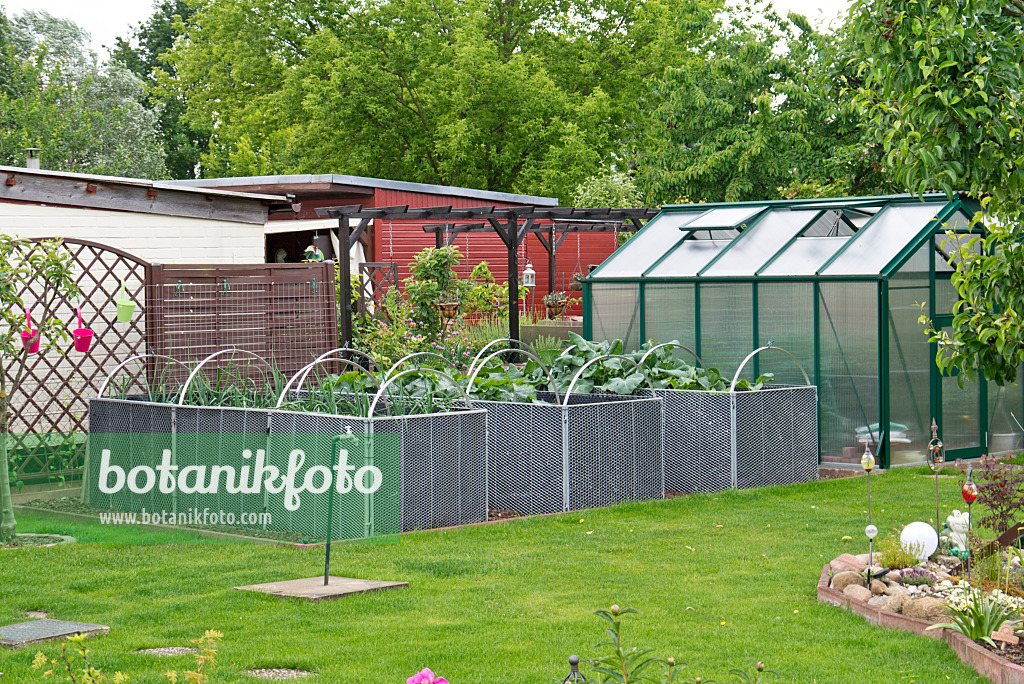 Hochbeete aus gelochten Metallwänden vor einem Gewächshaus in einem Kleingarten