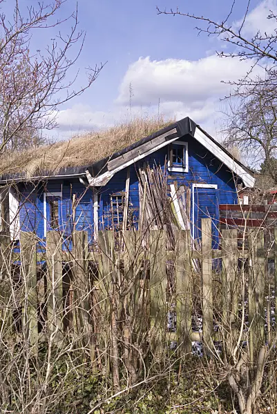 Hochbeete, Frühbeete und Gewächshaus in einem Kleingarten