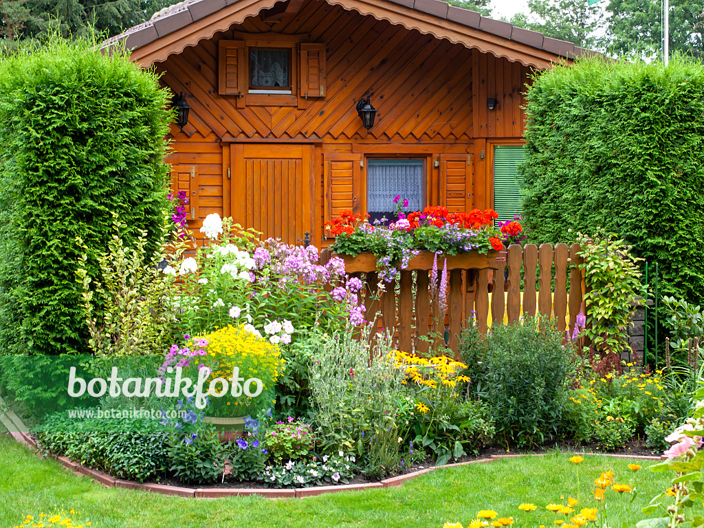 Hölzerne Gartenlaube und Blumenbeete in einem Kleingarten