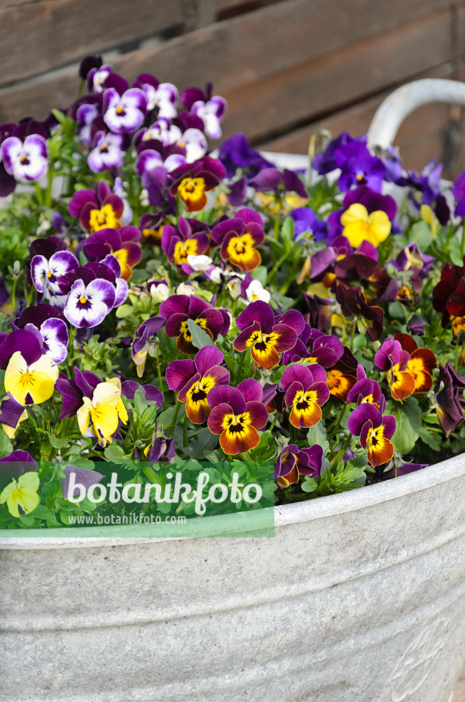 Hornveilchen (Viola cornuta) in einer Blechwanne