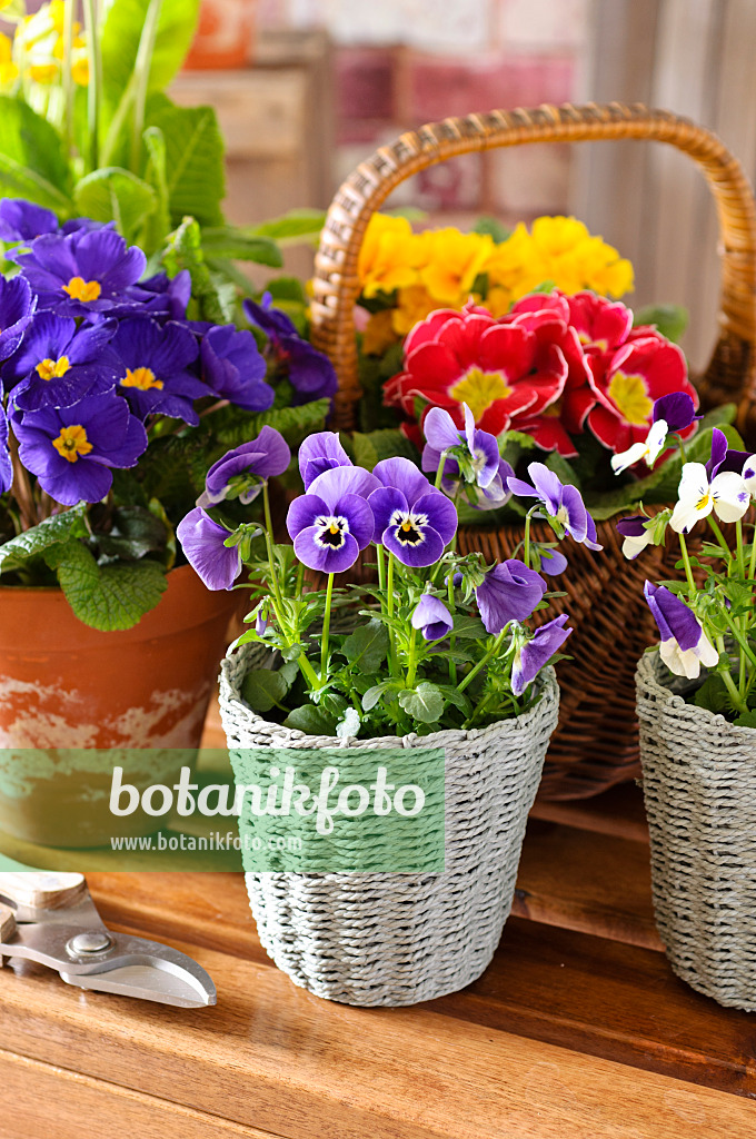 Hornveilchen (Viola cornuta) und Kissenprimeln (Primula vulgaris syn. Primula acaulis)