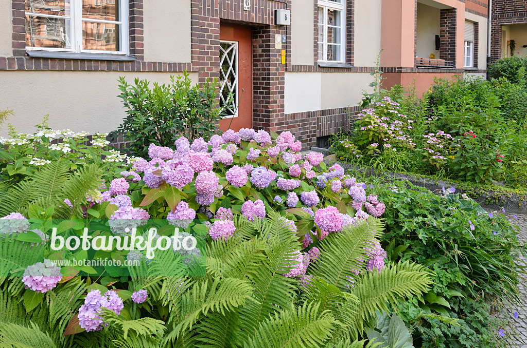 Hortensie (Hydrangea) im Vorgarten eines Mehrfamilienhauses