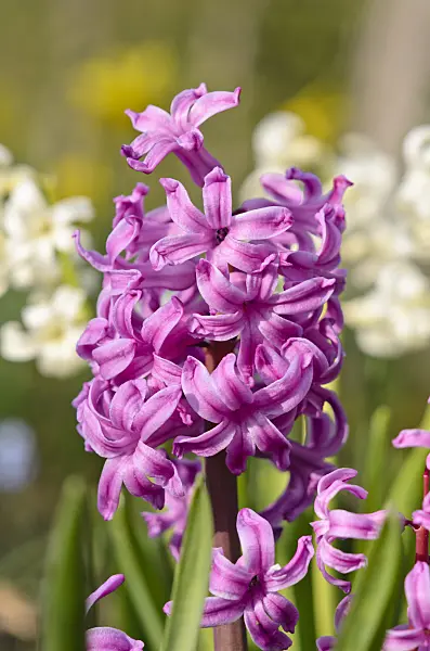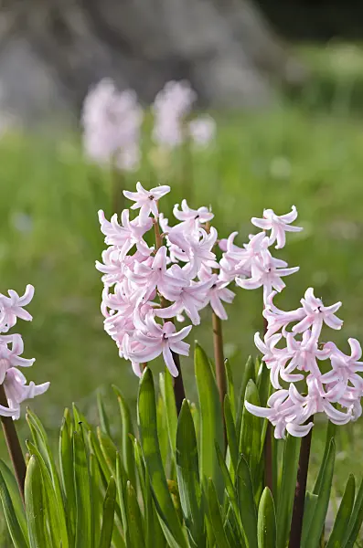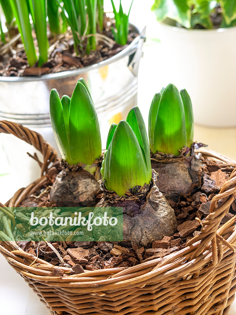 Hyazinthe (Hyacinthus) mit frischen grünen Zwiebelaustrieben, gepflanzt in einen Weidenkorb