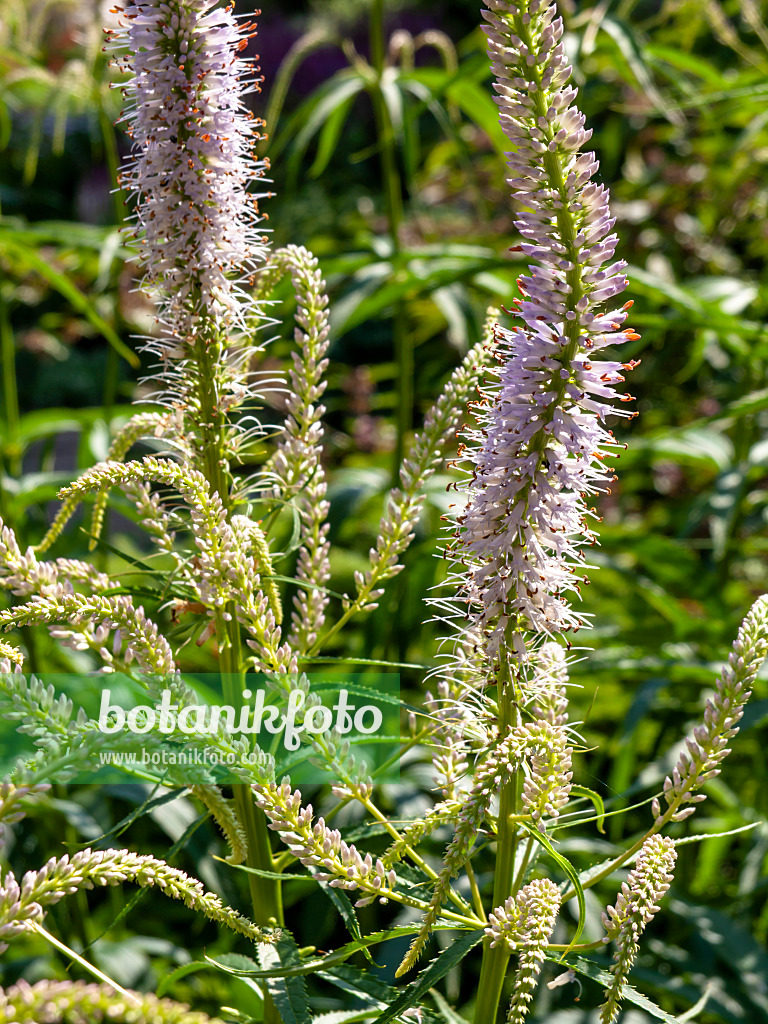 Veronicastrum virginicum, auch bekannt als Virginische Ehrenpreiswurzel, ist eine mehrjährige Staude aus der Familie der Wegerichgewächse. Sie stammt aus Nordamerika und wird bis zu 1,5 Meter hoch. Die Pflanze bildet schlanke, aufrechte Blütenkerzen mit kleinen, weißen bis blasslila Blüten von Juni bis August. Sie bevorzugt sonnige bis halbschattige Standorte mit feuchtem, nährstoffreichem Boden. Ideal für naturnahe Gärten und als Bienenweide.