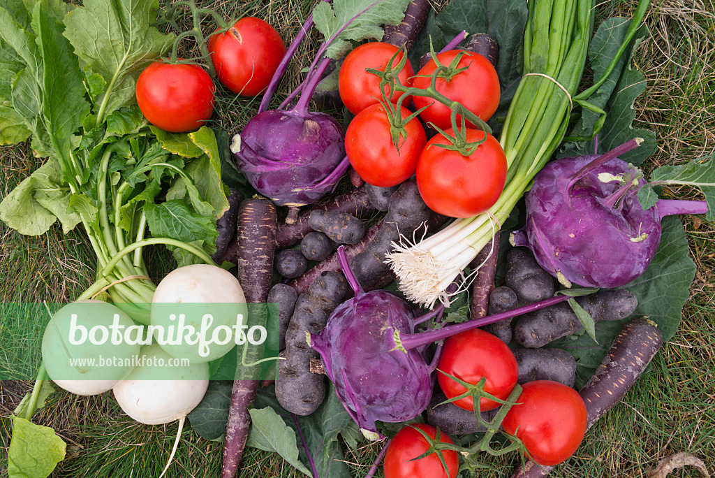 576010 - Kartoffeln (Solanum tuberosum 'Violetta'), Möhren (Daucus carota subsp. sativus), Kohlrabis (Brassica oleracea var. gongyloides) und Tomaten (Lycopersicon esculentum)