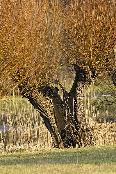 Korbweide (Salix viminalis) mit zusammengebundenen Bögen über einen Weg in einem Park