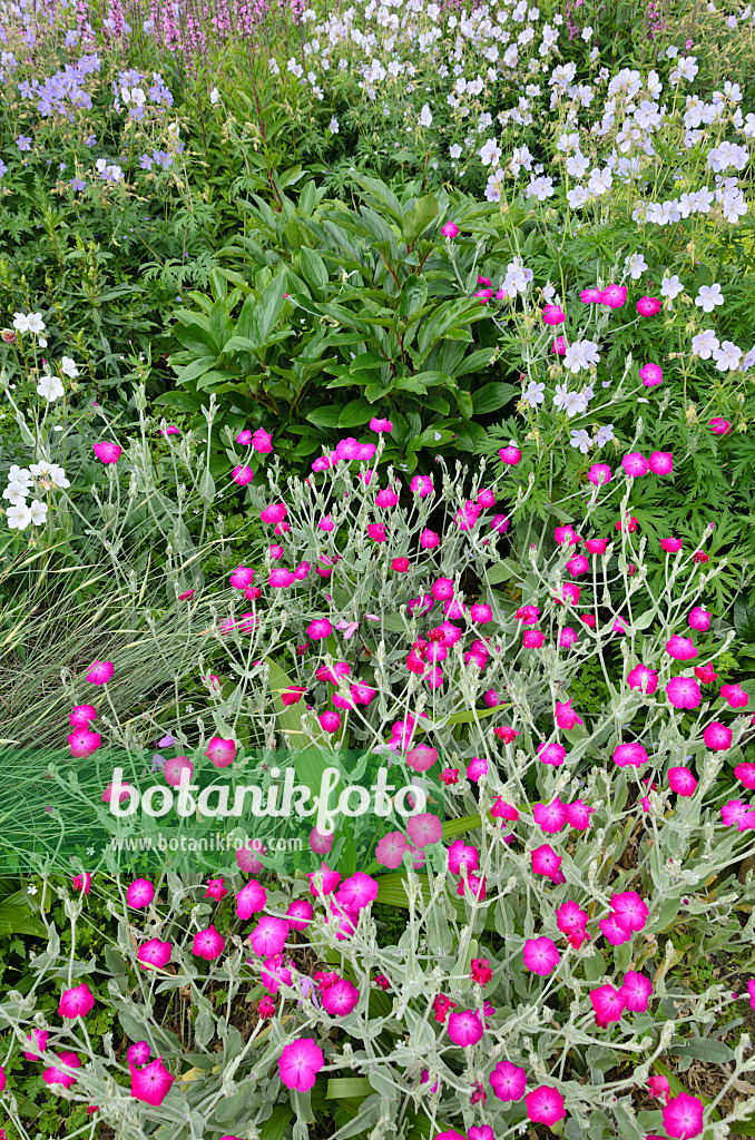 Kronenlichtnelke (Lychnis coronaria syn. Silene coronaria) und Storchschnabel (Geranium)