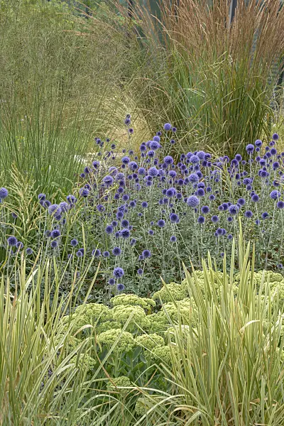 Kugeldisteln (Echinops), Taglilien (Hemerocallis), Stockrosen (Alcea) und Indianernesseln (Monarda)