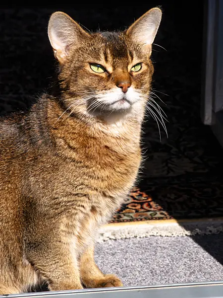 Müde Abessinierkatze kauert auf einem Teppich auf einer Veranda in der Sonne