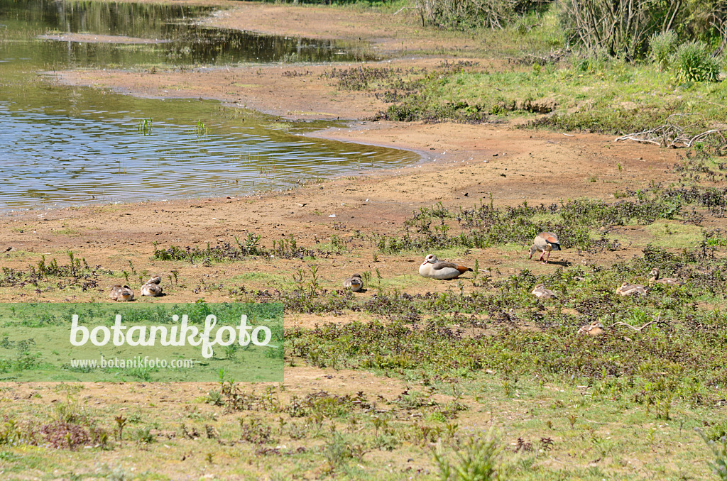 Nilgänse (Alopochen aegyptiacus) mit Jungvögeln, Nationalpark Zuid-Kennemerland, Niederlande