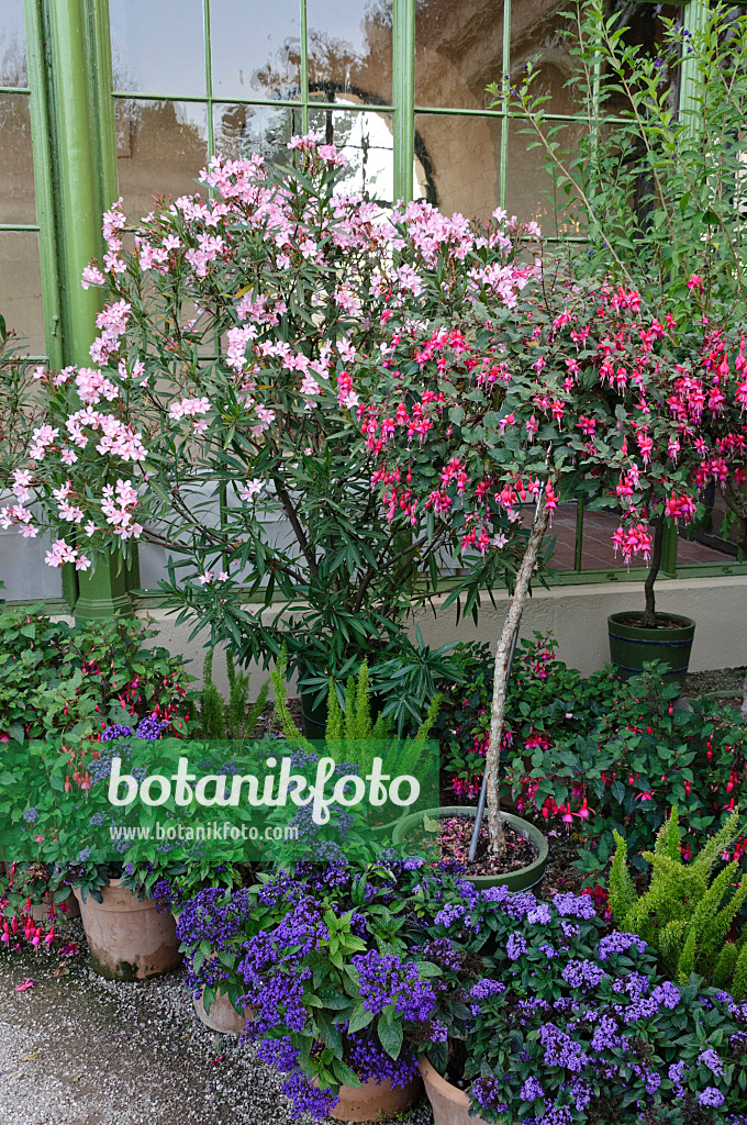 Oleander (Nerium oleander), Fuchsien (Fuchsia) und Heliotrop (Heliotropium)