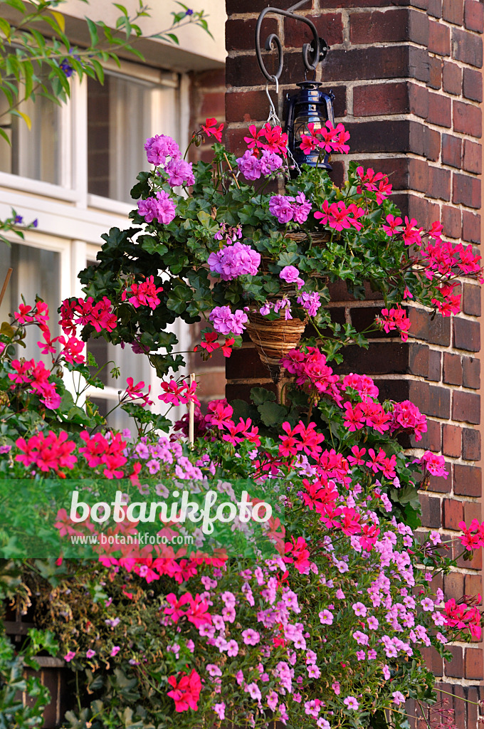 Pelargonien (Pelargonium) und Zauberglöckchen (Calibrachoa) auf einem Balkon