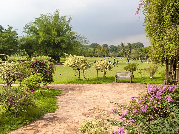 Regenbaum (Albizia saman) und Nestfarn (Asplenium nidus), Fort Canning Park, Singapur